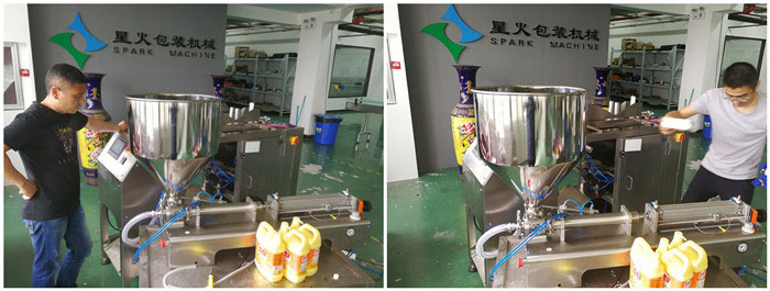 自立袋洗衣液自動包裝機客戶調(diào)試現(xiàn)場: