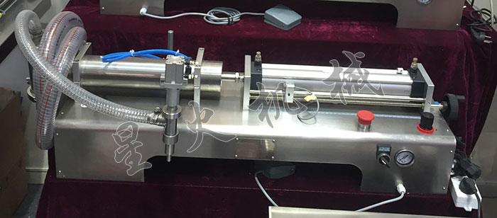 灌裝機為半自動活塞式灌裝機。通過氣缸帶動一個活塞來抽取和打出物料用單向閥控制物料流向,用磁簧開關(guān)控制氣缸的行程,即可調(diào)節(jié)灌裝量。